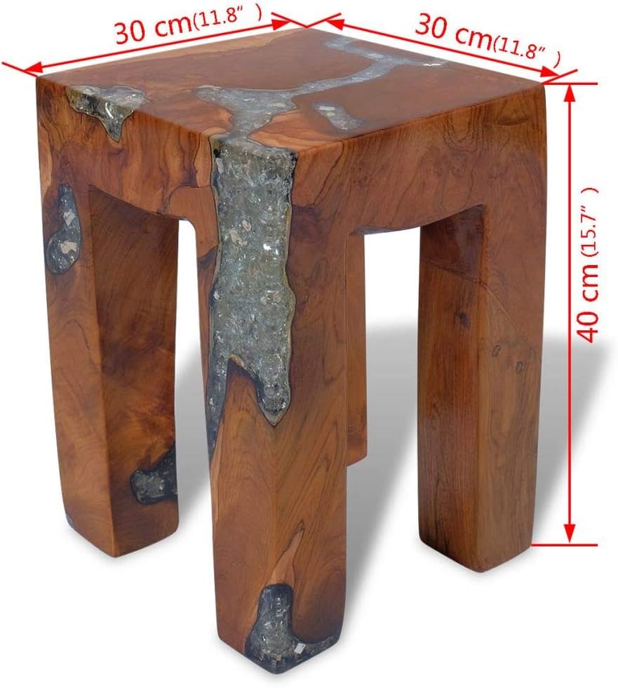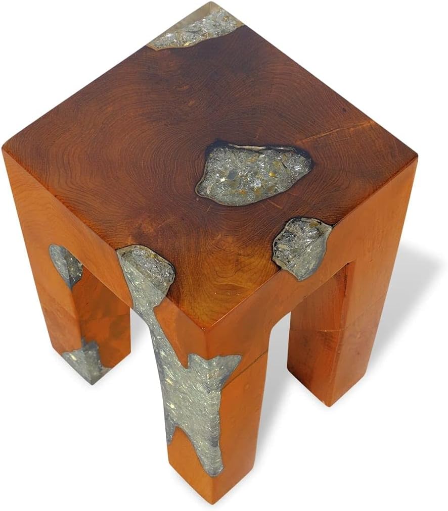This unique wooden stool, made of solid teak with a transparent resin decoration, exudes a rustic charm and is a real eye-catcher. The stool can also be used as a footrest, side table, etc.The stool is fully handmade and the craftsmanship adds to its luxurious appearance. It also features four stable legs.Important note: As wood is a natural product, the colors and grain patterns vary from piece to piece, making each of our stools unique and different from the next. The delivery is random, ensuring the exclusivity and individuality of your product.Color: MulticolorMaterial: Solid teak with a clear lacquer finish + transparent resin with crushed glassDimensions: 11.8" x 11.8" x 15.7" (L x W x H)With four stable legsFully handmade