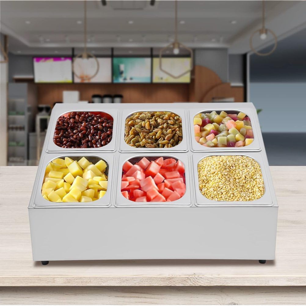 Stainless steel pizza and fruit sauce dispenser with a slanted shelf for storing condiments, toppings, jams, fruits, and various ingredients, suitable for kitchen pantries. Ideal for busy kitchens, parties, homes, high-traffic catering services, and the food service industry.✦ Specifications:Type: Sauce dispenser; Stainless steel condiment station with steaming tray and lid, suitable for salads, jams, sauces, and pizza condiments.Color: SilverMaterial: Stainless steelProduct Dimensions: As shown in the pictureNumber of Containers: 1/6 cup, 1/9 cupCapacity per Container: Approx. 1/6 cup, Approx. 1/9 cupCapacity: 2 liters/0.53 gallons✦ Includes:1 x Pizza Condiment Station Set