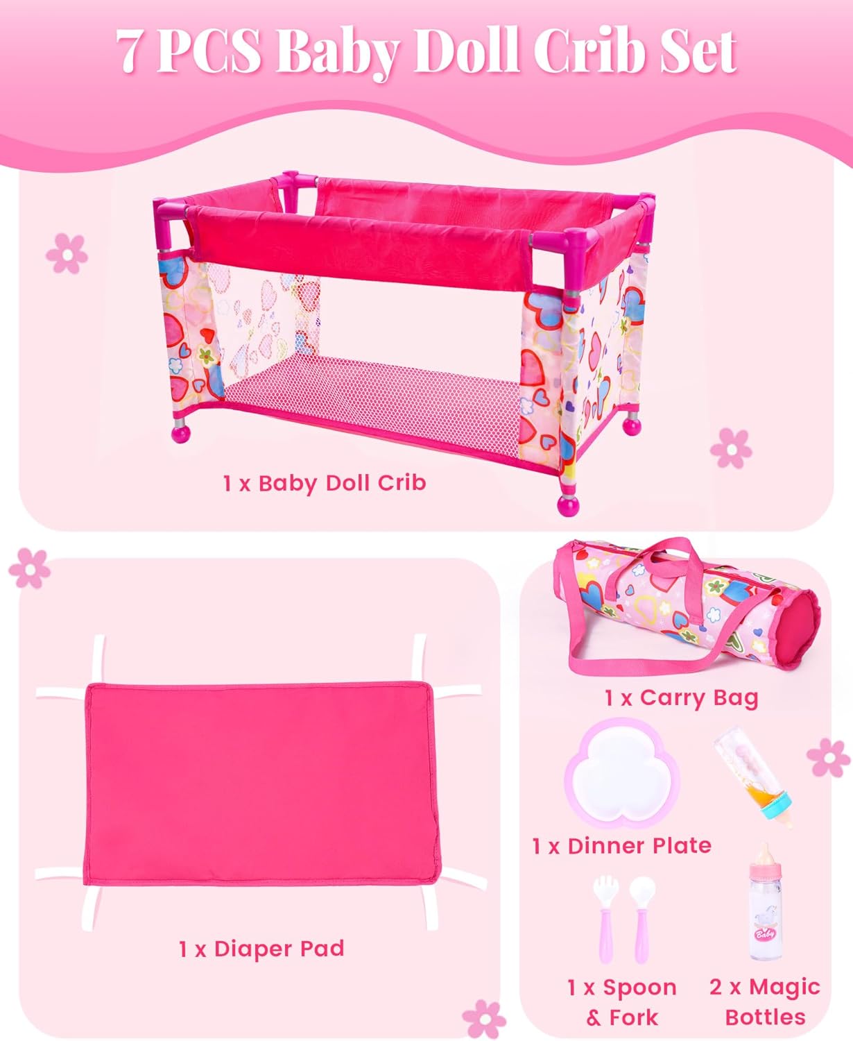 | Included Components | 1*baby doll crib, 1*baby doll diaper pad/mattress, 1*baby doll dinner plate, 1*baby doll fork & spoon, 2*baby doll bottle |