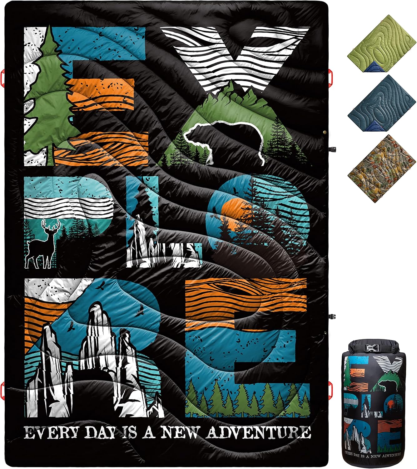 RIOYALO ECO-SILKTM Puffy Camping Blanket - Forest Camo ๐ ECOSILK PUFFY BLANKET ๐ This stylish blanket is a perfect gift for anyone who loves camping, hiking, backpacking and outdoor recreation activities. It is thermal insulated. It's a water resistant and tear resistant blanket that you can bring to anywhere. ๐ซ LIGHTWEIGHT & PACKABLE ๐ซ Measuring 55โ X79โ and less than 2 LBs, It is ultralight and highly portable when packing into the compact 6โX15โ rolltop stuff sack comes with. It can also be used as car blankets or lap blankets too. ๐ฏ WEARABLE LIKE PONCHO LINER ๐ฏ The distinguished SNAPCLIP allows you to wear the blanket like a woobie, free your hands for other activities like photo shooting, preparing food, holding your pet while staying warm. The Snap Button is a surplus and more convenient. ๐ซ THERMAL INSULATION ๐ซ Light-weighted, fluffy, and cotton-like feeling, ECO-SILK cotton synthetic fiber provides this packable blanket the best combination of warmth, comfort and weight. ๐ซ WATER RESISTANT & TEAR RESISTANT ๐ซ The 30D diamond nylon shell with DWR treatment provides superior strength and exceptional weatherproof features for this warm blanket. ๐ฏ THUMB LOOPS ๐ฏ Use them to wrap the blanket tight around you for windproof and extra warmth. They can be used as corner loops too. ๐ฏ REFLECTIVE STRIP ๐ฏ Great for nighttime visibility. Perfect safe feature for outdoor enthusiasts. ๐ EASY CARE ๐ It is machine washable. Wash it cold and hang dry or tumble dry low.