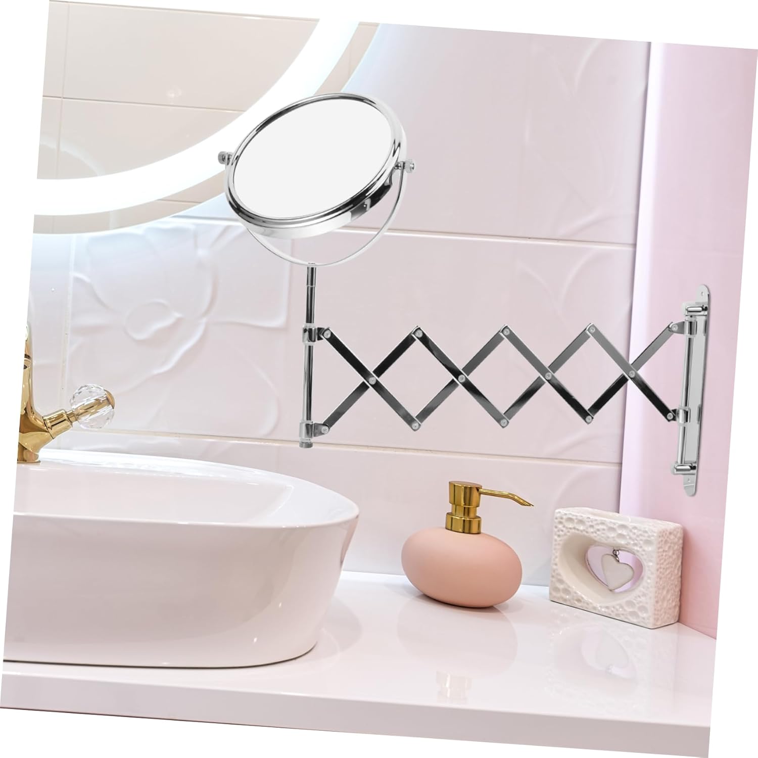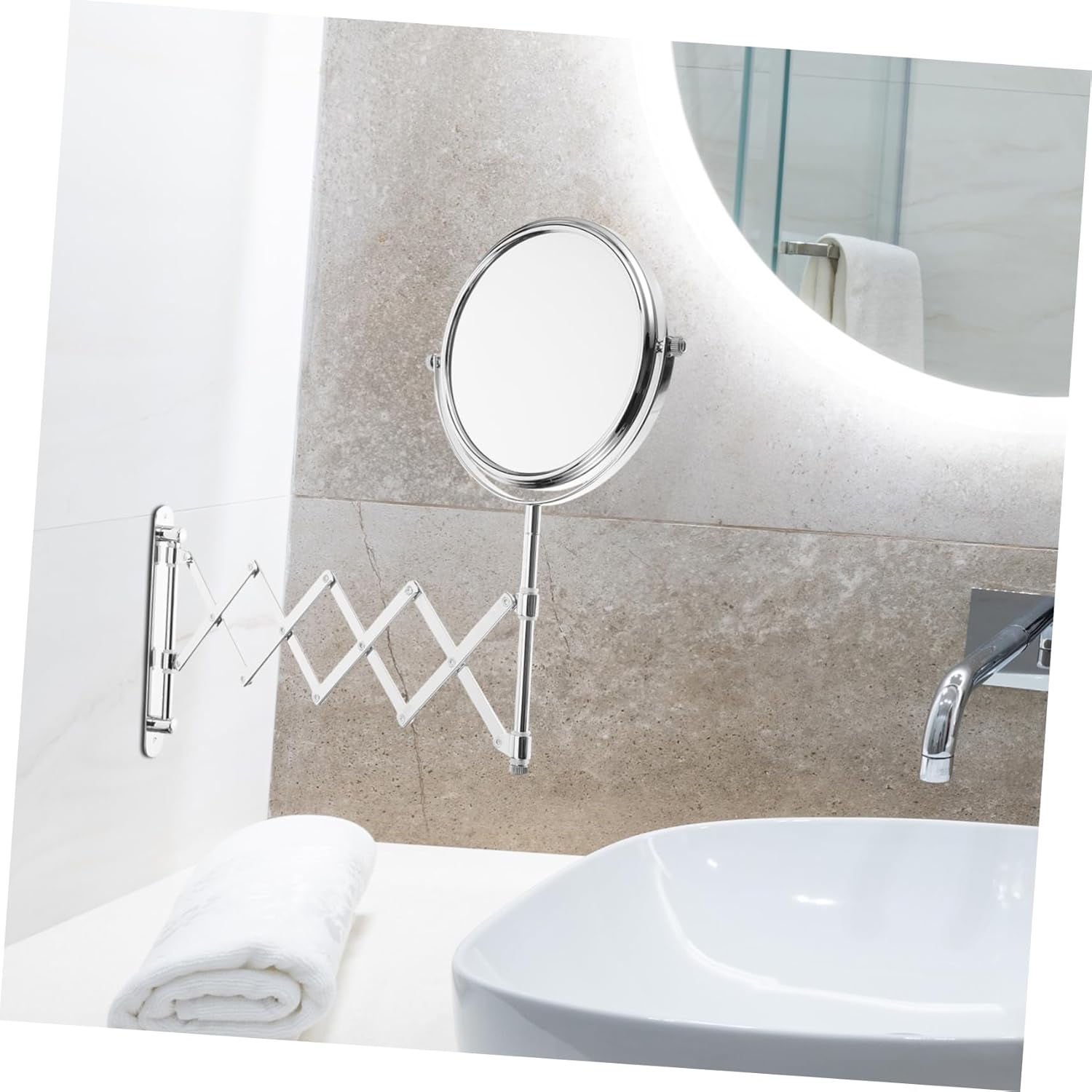 Package List 1 x 6 Inch 3X Magnifying Round Wall Mirror Two-Sided Retractable Bathroom Mirror 360 Degree Swivel Makeup Mirror Characteristics - Bracket: 4.5x18.6cm(1 cm=0.39inch) extendable mirror - Material: Metal wall mirror. - Mirror Size: 6 inch in diameter makeup mirror - Magnification: 3 times swivel mirror - The 3X magnification side provide you more details of your face for touch-ups, lenses, and all-around make-up application wall mounted mirror. - ColorSilver - Attractive plating feels smooth and looks delicate and modern. - Quick installation, easy to maneuver. - It mounts with a narrow bracket that fits the small space so for place even if your bathroom does not have much room. - Extends up to offer you view angle, while still being firm enough to hold its body.Goods Descriptionmakeup mirror want to have delicate makeup that looks natural and ? I this 3 times magnifying vanity mirror will be helpful to you! 360 degree-rotatable design allows it to own two sides that both can work.wall mounted mirror Retractable body is much more space saving than those with stands