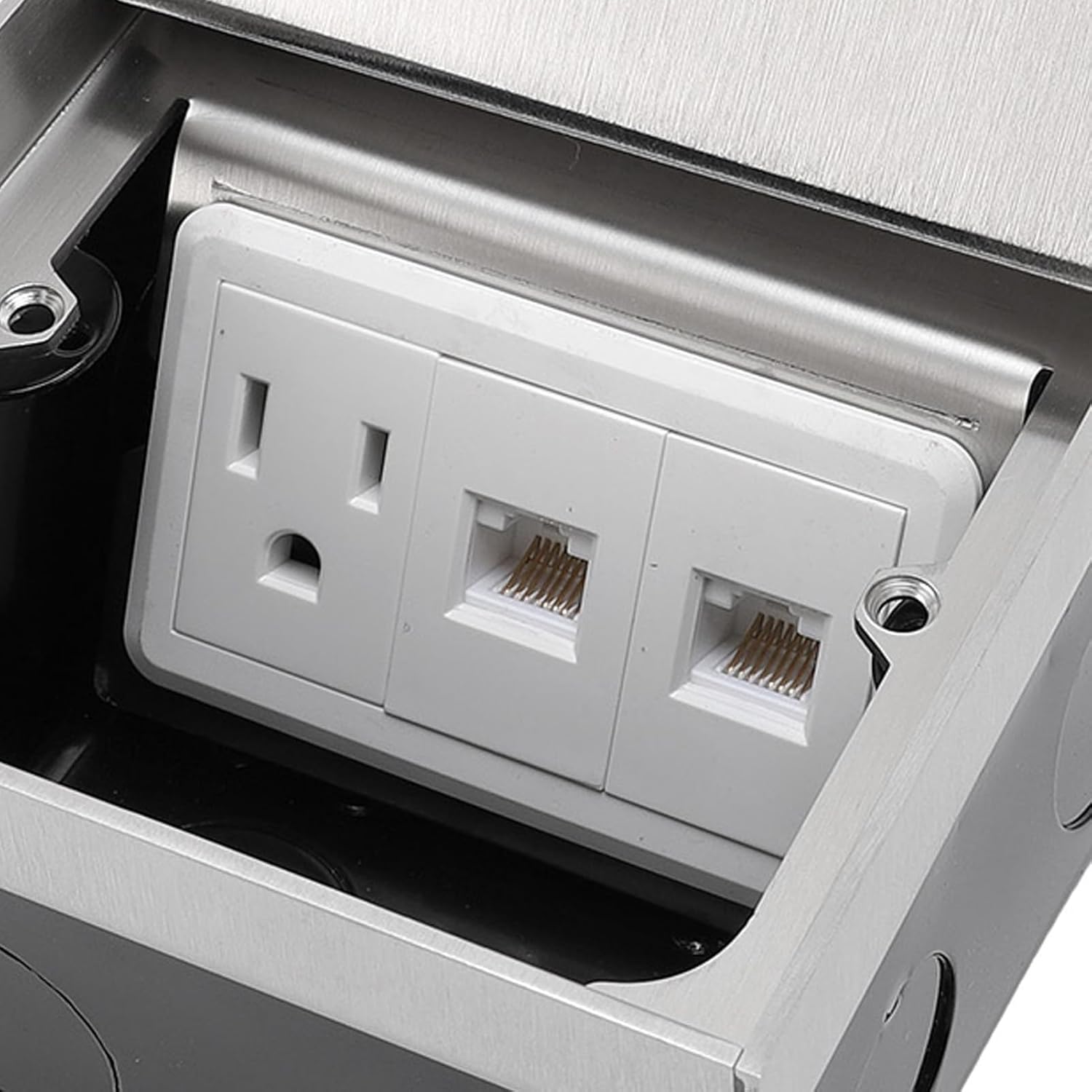 Spec: Item Type: Recessed Floor Electrical Outlet Kit Material: PC, stainless steel Socket Type: 1pc 3 Prong and 2pcs network ports Color: Silver Package List: 1 x Cover Plate 1 x Base 4 x Screws Note: Pay attention to electrical safety.