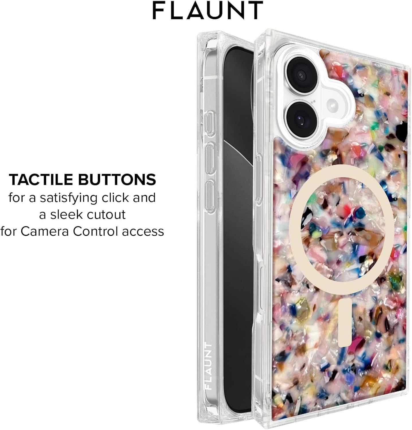 The FLAUNT SQUARE Protective Case for iPhone 17 combines functionality and luxury with its unique SQUARE design and rainbow confetti tortoise shell finish. Offering a slim, shockproof build, it provides superior protection against drops of up to 12 feet while maintaining a lightweight profile. Featuring cushioned corners and edges, the case is super sleek, more protective, and easier to grip. Perfect for everyday use, it fits seamlessly with MagSafe accessories, ensuring you stay connected and powered throughout the day. Elevate your phone’s look with a SQUARE case that blends both fashion and protection seamlessly.FLAUNT SQUARE Protective Case Features:Rainbow Confetti Tortoise Shell Finish for a Luxury AestheticOfficial SQUARE Design12ft Drop ProtectionFull MagSafe Compatibility for Easy Wireless Charging & AccessoriesCushioned Corners for Enhanced Shock Absorption & Extra ProtectionHigh-quality Shockproof TPU MaterialOne-piece Seamless DesignRaised LipSlim Profile for Lightweight, Comfortable GripPrecise Cutouts, Fit for iPhone 17Anti-Scratch Coating1 Year WarrantyWho Are We: FLAUNT is a fashion-forward brand that combines style and functionality, offering trendy and high-quality SQUARE phone cases for those who love to showcase their personality while ensuring maximum protection for their devices. FLAUNT’s collection includes a variety of sleek, chic, and durable cases, designed to suit every occasion and every mood. With a focus on providing both aesthetic appeal and practical features, FLAUNT SQUARE cases deliver reliable protection while complementing your style.