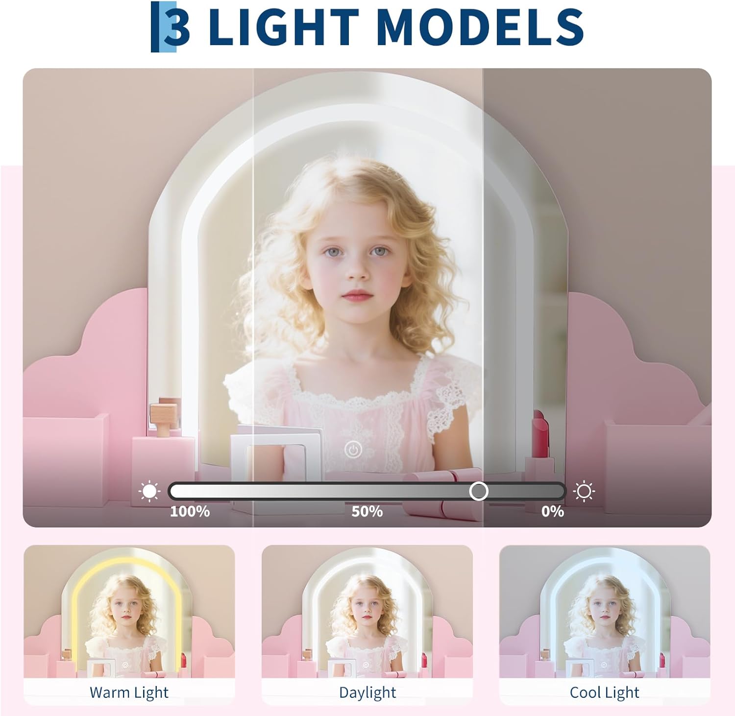 Kids Vanity with Lighted Mirror & Stool, Little Girls Vanity with Adjustable LED Light, Storage Drawer & Shelves for Girls 3-9, Pink