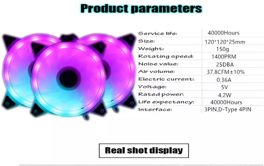 Product description:1. The light color and color changing speed can be adjusted through the remote control.2. Lower the computer temperature. Beautiful and peaceful.3. Switch various lighting modes through the remote control.4. Suitable for DIY computer.Rainbow lights make your computer more beautifulProduct parametersApplication: computer case fanCompatible CPU: Power: 4.2WBearings: Fluid BearingsFan life: 50000 hoursFan Speed Control: 1400 rpmNoise: 21dBAFeatures: Support RGBAir volume: 38CFMNumber of wires: 1 wire powerInterface: 6pinHeat sink material: plasticFan size: 120x120x25mmPackage Included:1 x Laptop Cooler (other demo products not included)Notice:1. Due to manual measurement, please allow 2-3% error.2. Due to different monitors, the color may be different, please understand.Integrated Dust Filtration Extends Laptop Lifespan: This cooler fan features a high-density, removable dust filter that effectively protects the internal fans of laptops. It captures hair and debris, them from entering the vents, thus solving the common "pressure cooker" dust buildup problem, significantly extending the lifespan of your expensive gaming PC and reducing costly professional cleaningIntuitive Touch-Mute Button adjusts RGB lighting with a single finger, minimizing distractions. Configured memory function, the laptop cooler RGB eliminates repeated selections and brings itself alive when power