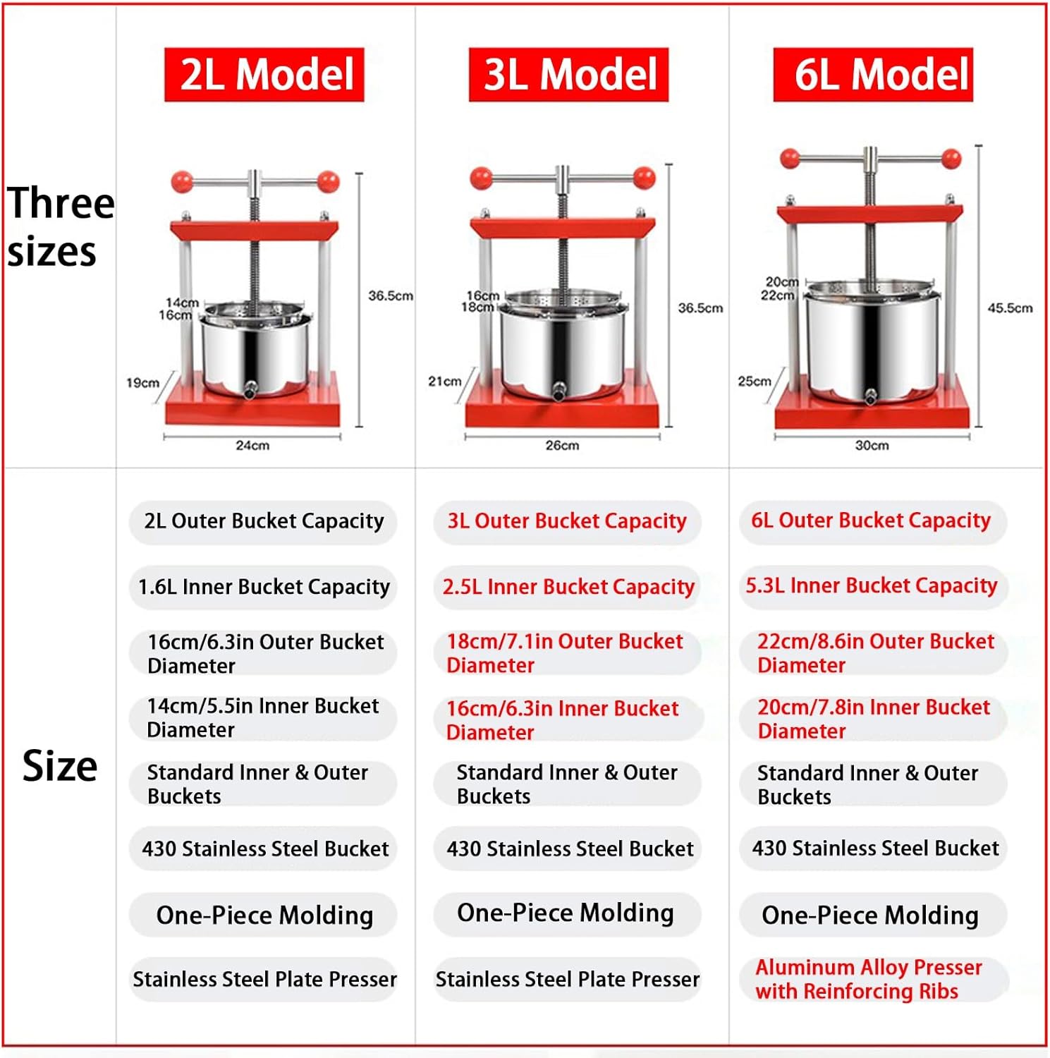 Product ParametersProduct Name:Commercial Manual Fruit Press Juicer/Heavy Duty Hand Press Orange Juicer PressMaterial: Stainless Steel + Iron + Aluminum AlloyColor: RedInner and Outer Drums: RemovableGap Between Inner and Outer Drums: 1cmSpecifications: 2L/3L/6LFeatures1.Multi-Purpose Juicing & Citrus Specialization:Efficiently extracts grape juice, herbal teas, coconut milk (pre-chopped), vegetable fillings, and carrot/pear/apple blends. Doubles as a high-performance Lime Squeezer Stand and Orange Juicer Squeezer, effortlessly handling citrus fruits like lemons and oranges for maximum versatility.2.Hygienic Manual Operation & Easy Maintenance:Spiral press mechanism separates pulp and juice automatically—no manual squeezing required. Features detachable stainless steel parts for deep cleaning with no residue. The ergonomic Manual Citrus Press design reduces physical strain while ensuring sanitary processing.3.Commercial-Grade Durability & Efficiency:Constructed with 3mm stainless steel (2L/3L models) or 7mm reinforced aluminum (6L model) for heavy-duty use. Non-slip handle and trapezoidal screw provide powerful pressing force, while the thickened filter bag boosts juice yield. Lime Squeezer Stand stability and Orange Juicer Squeezer robustness ensure long-term reliability.Package Included:Manual Juicers x1