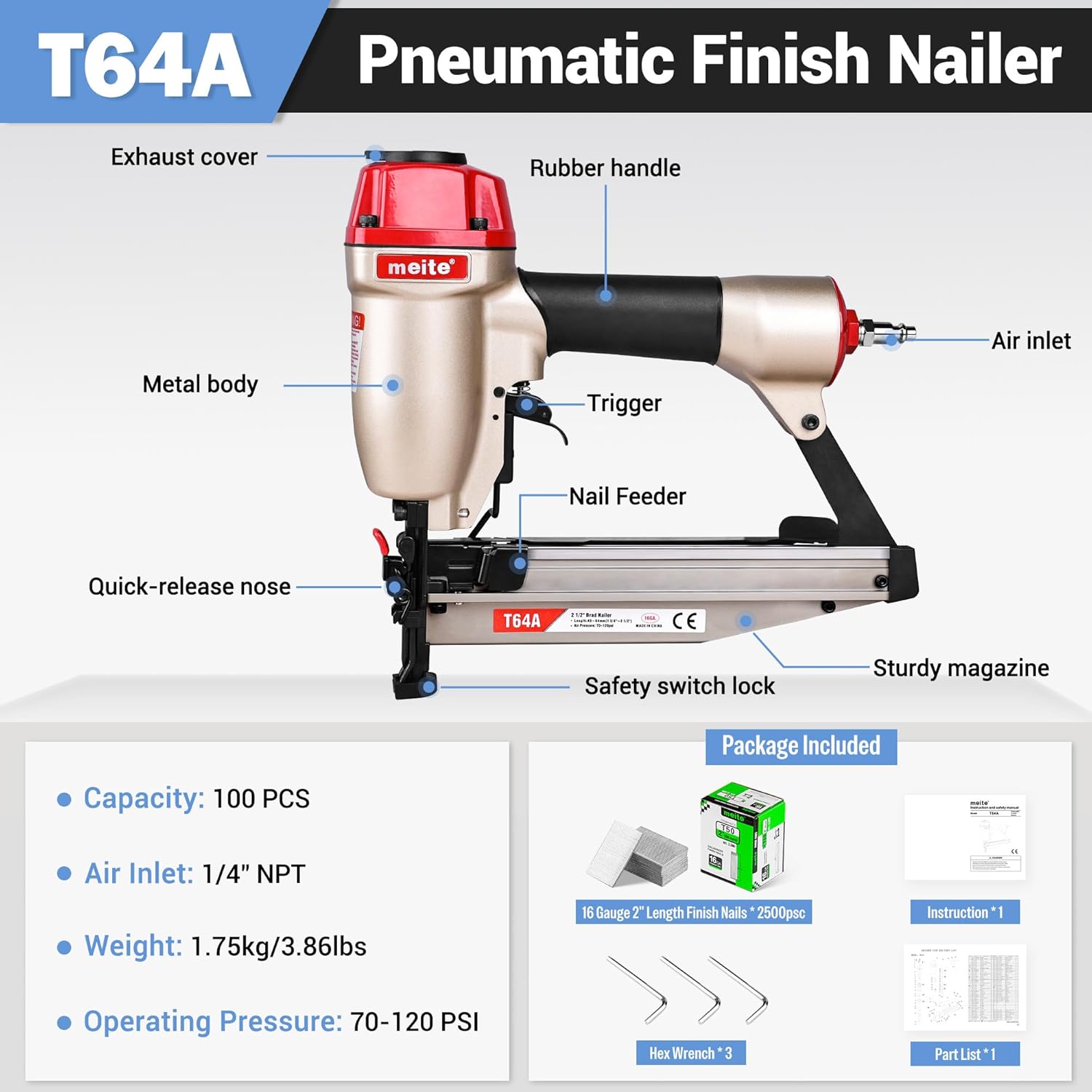 meite 16 Gauge Finish Nailer with 2-Inch Finish Nails 2,500PCS, Pneumatic Straight 16GA Finish Nail Gun with Quick Jam Release for Baseboard Cabinetry Trim, Accepts 1-1/4" to 2-1/2" Nails meite 16 Gauge Finish Nails 5 Sizes Assorted Set 2,500PCS, Galvanized Straight Finish Nails for Pneumatic Cordless Finish Nailer on Crown Molding Cabinetry (1", 1-1/4", 1-1/2", 2", 2-1/2" Each 500PCS)