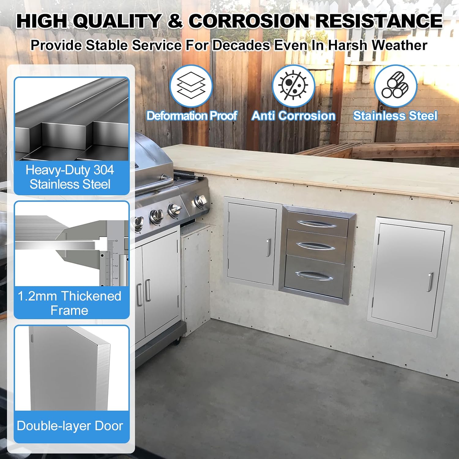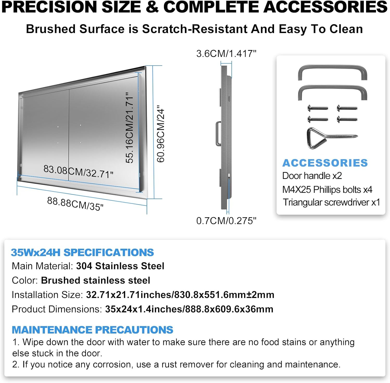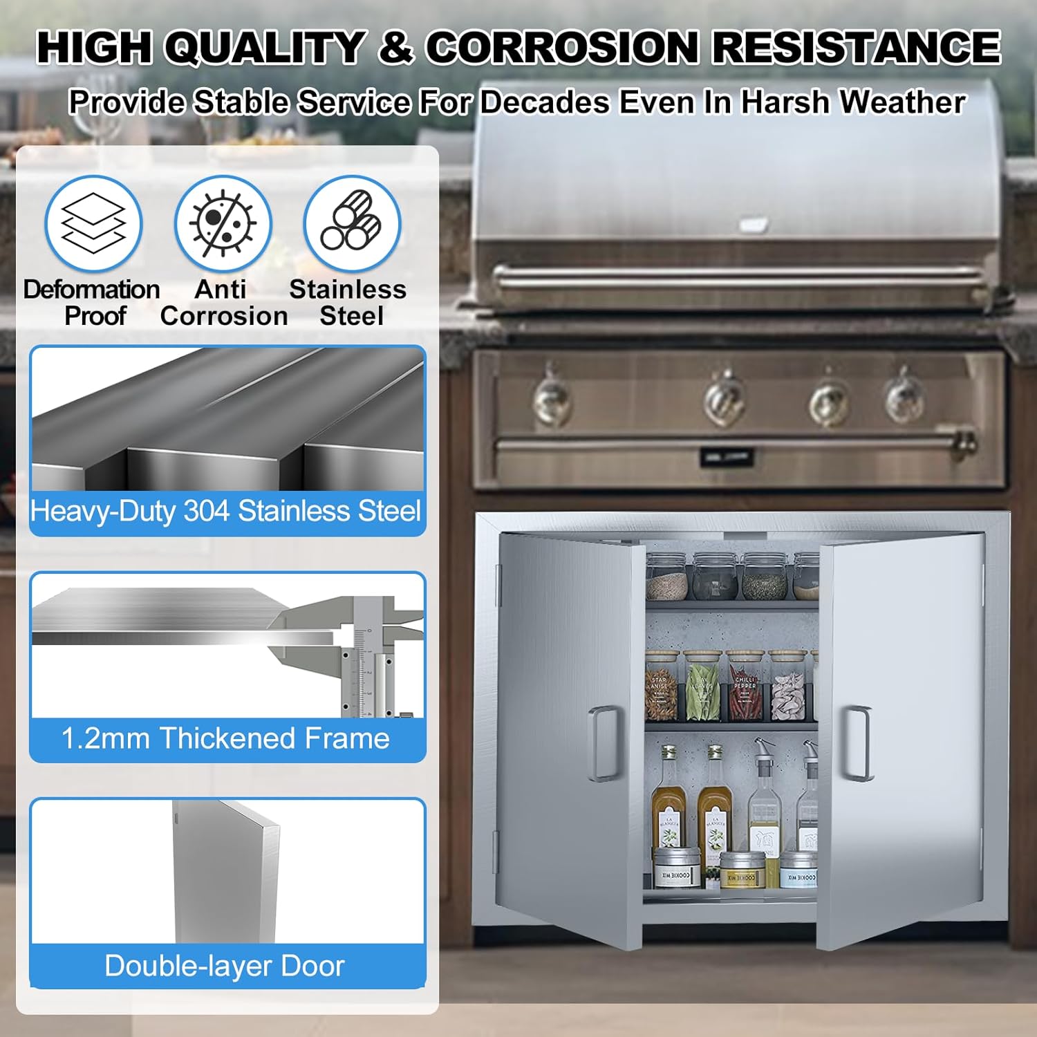 • ANTI-CORROSION & HIGH-QUALITY STAINLESS STEEL--TRUE 304 stainless steel outdoor kitchen door is rust-proof, waterproof, and resistant to warping. The double-layer stainless steel BBQ door is securely attached to a 1.2mm thick reinforced frame with precision welded steel hinges for stability and durability. Its integrated design offers lasting durability, even in harsh weather, with minimal maintenance required.