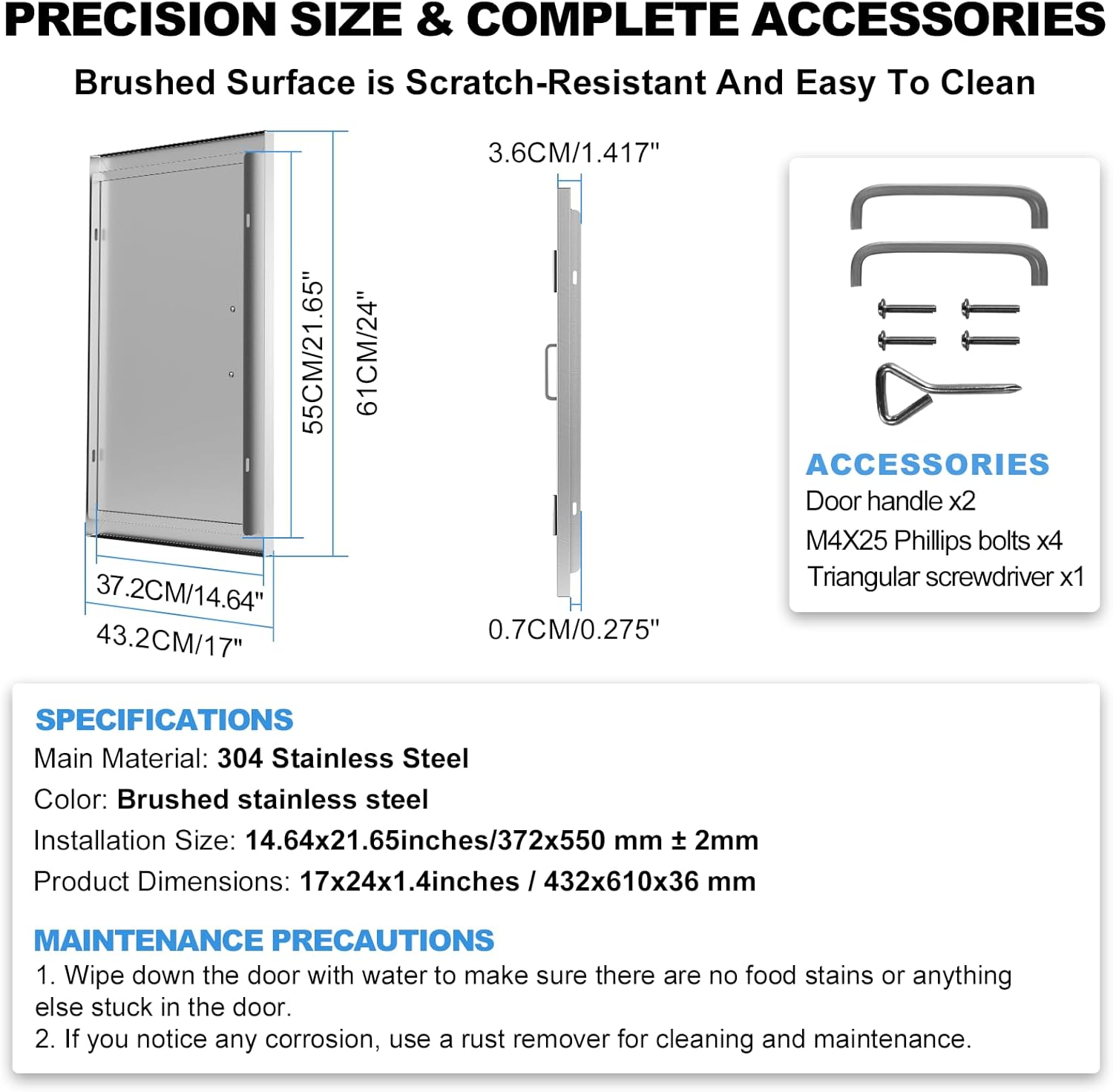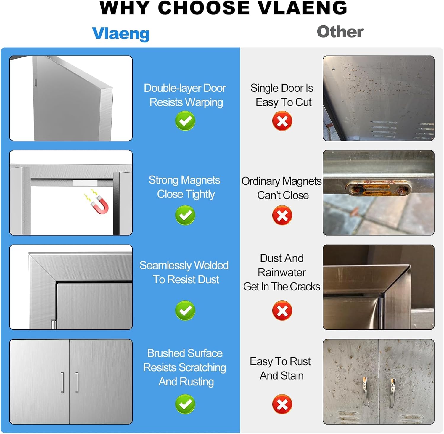 • WHY CHOOSE Vlaeng—Our outdoor access door features high-quality 304 stainless steel with thick 1.2mm frames and double-layer doors, more durable. Strong magnets ensure easy closing. LIFELONG after-sales service from an industry-leading factory. Maintenance Precautions: Wipe down the grill door with water to make sure there are no food stains or anything else stuck in the door. If you notice any corrosion, use a rust remover for cleaning and maintenance.