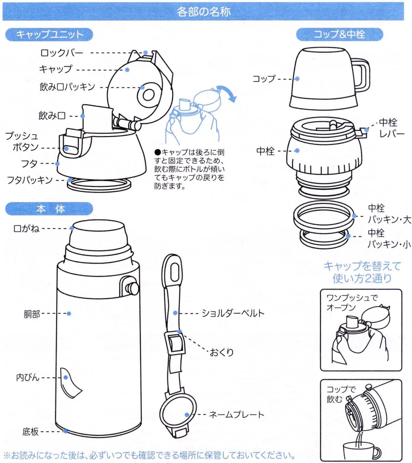Water bottle that can be used for both drinking directly and drinking from a cup You can drink cold drinks as is. 2-way type that can be used for direct drinking or drinking a cup. Locking feature prevents lid from opening A cup is recommended for hot beverages. Perfect size for children and elementary school students. 11.8 fl oz (350 ml). Shoulder strap for hanging from shoulder, nameplate