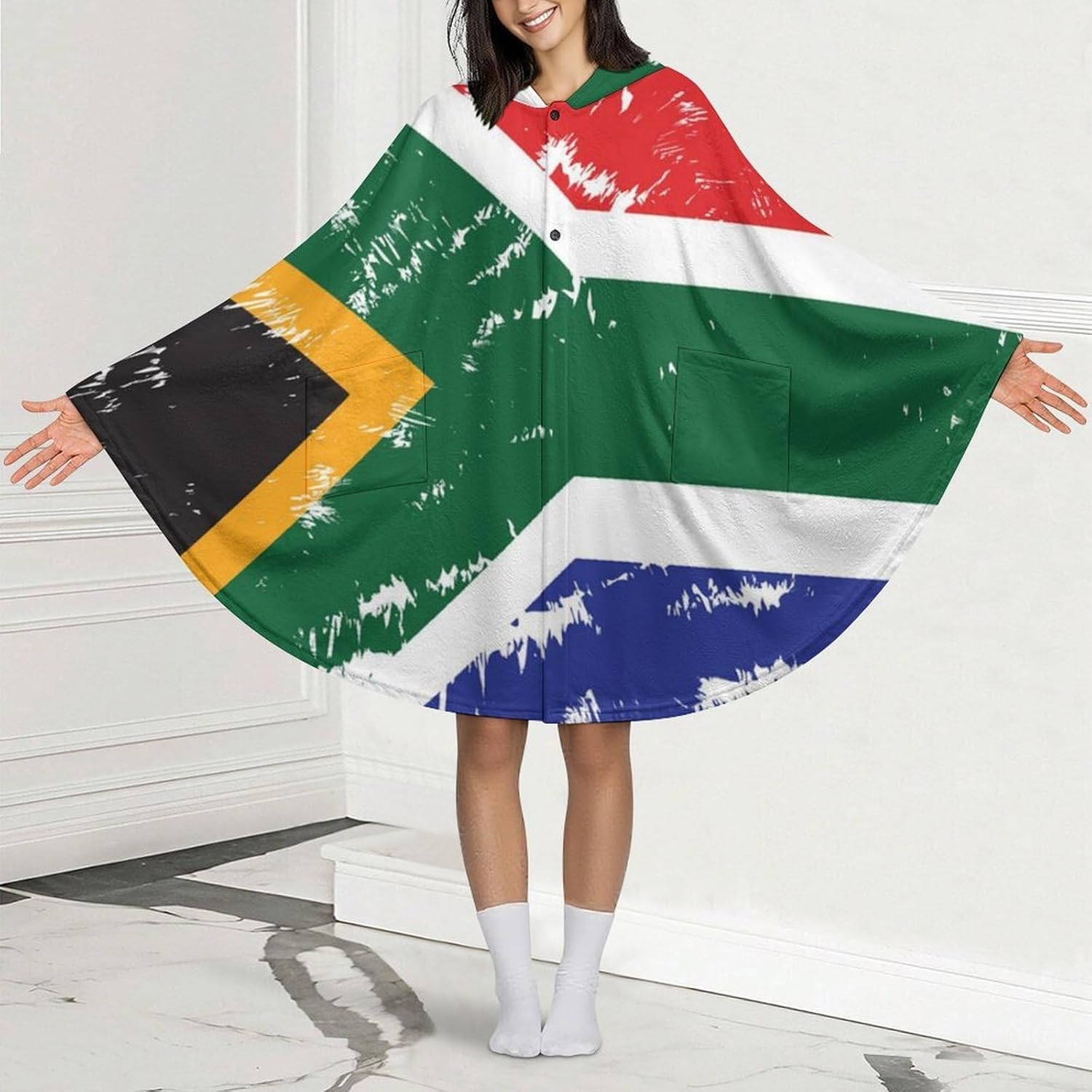 The wearable blanket is made of soft and comfortable flannel fabric, which makes you feel warm in spring, autumn and winter. It has a cape-like shape, a button closure for easy wearing and taking off, and two pockets.